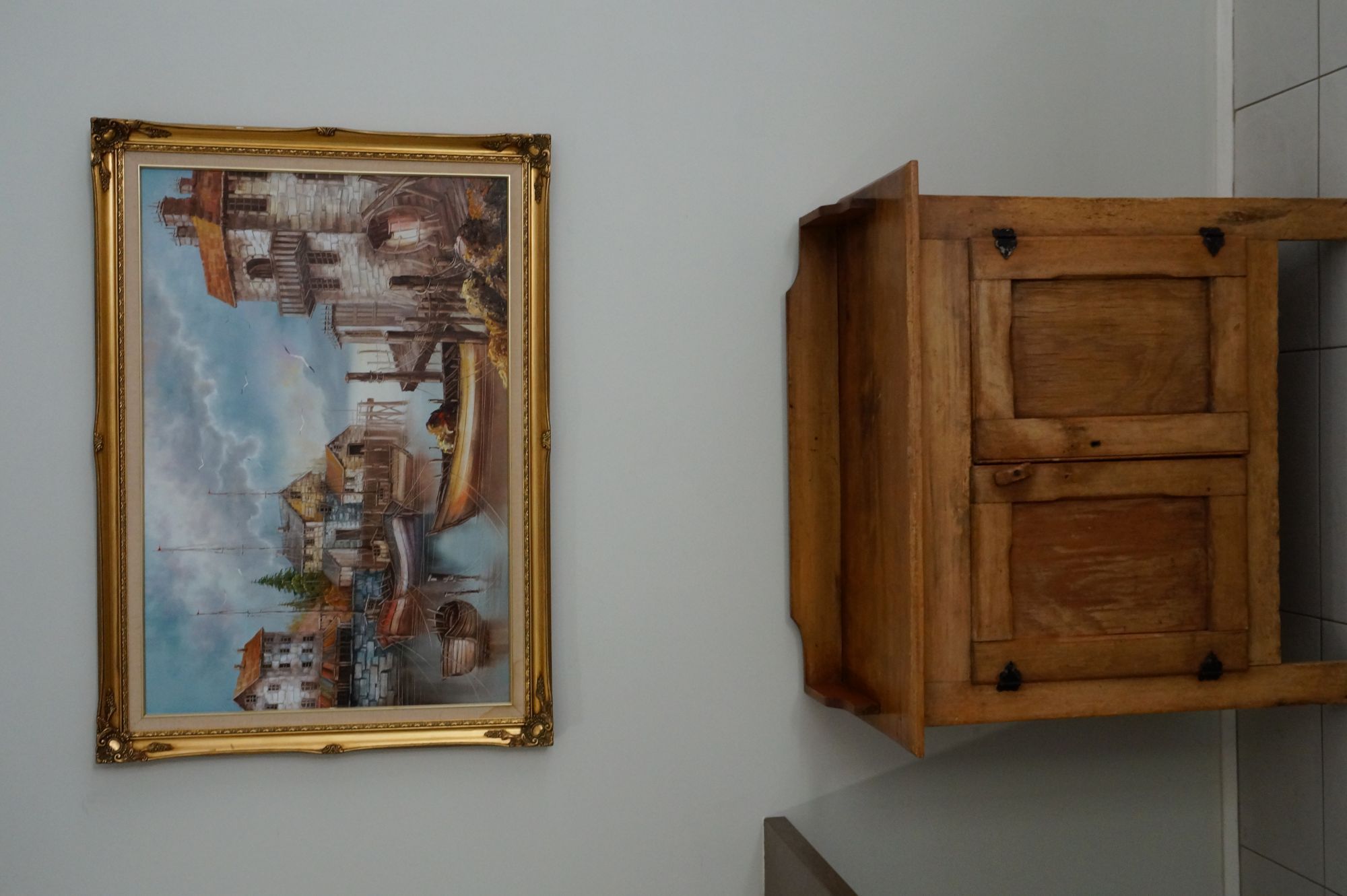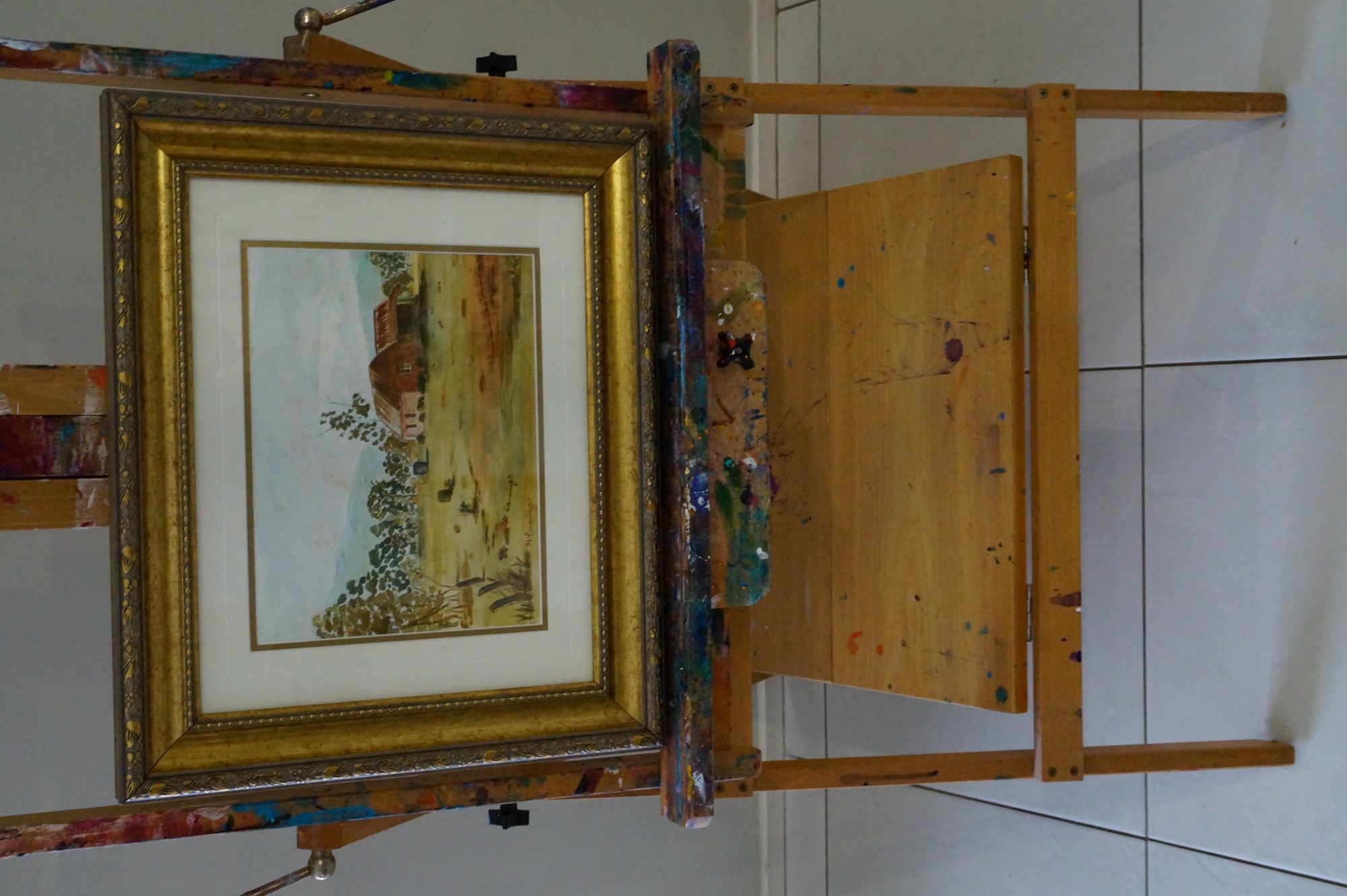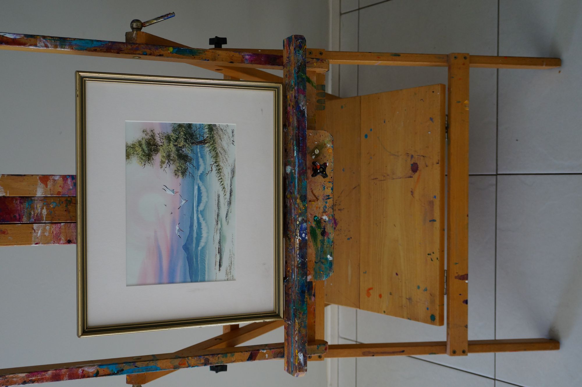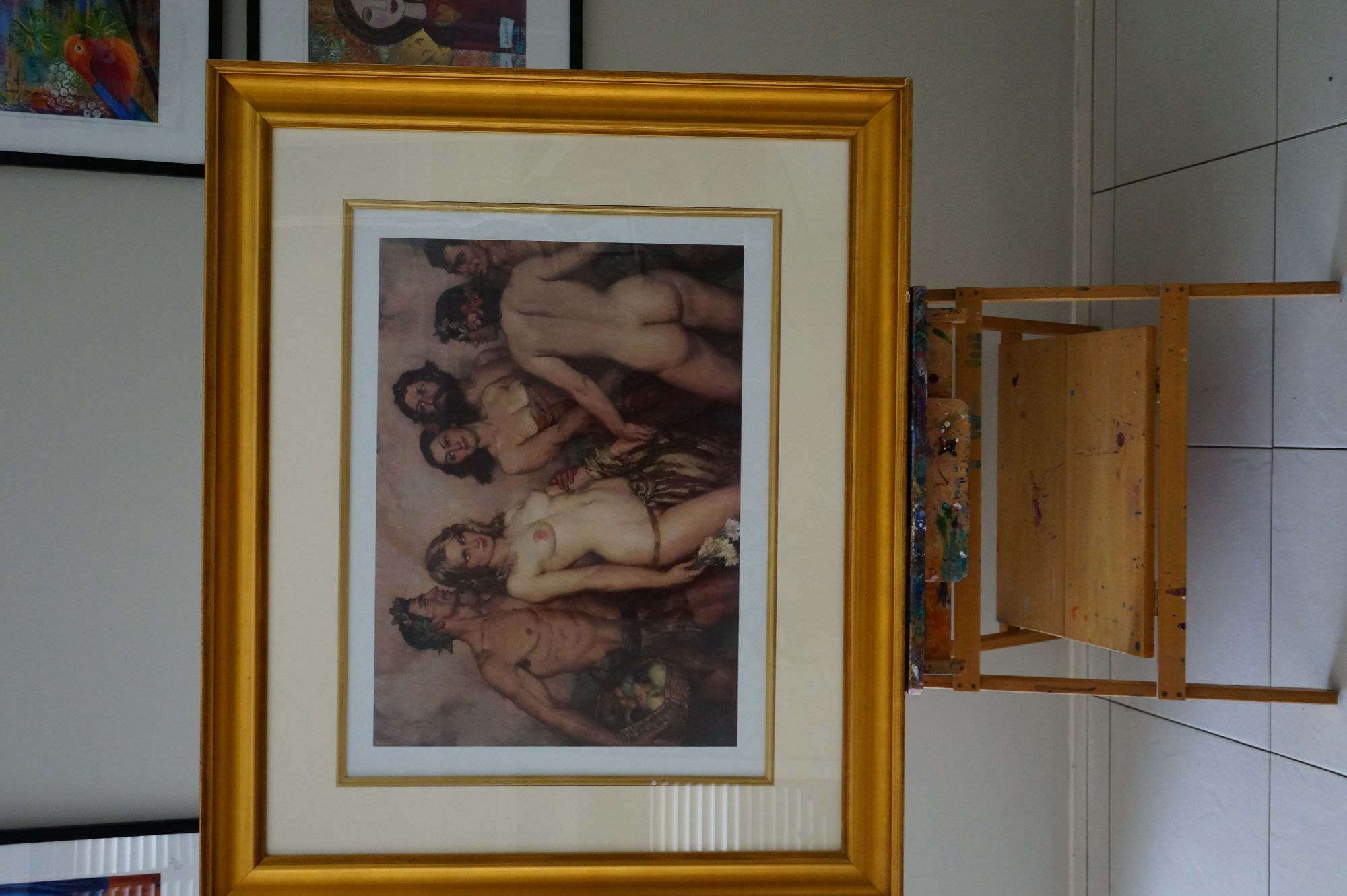 This art piece was acquired with some damage to two corners of the frame. Some restoration work on these two corners will be required before sale. It was such an outstanding piece of art that it was decided to purchase regardless of the damage. |
